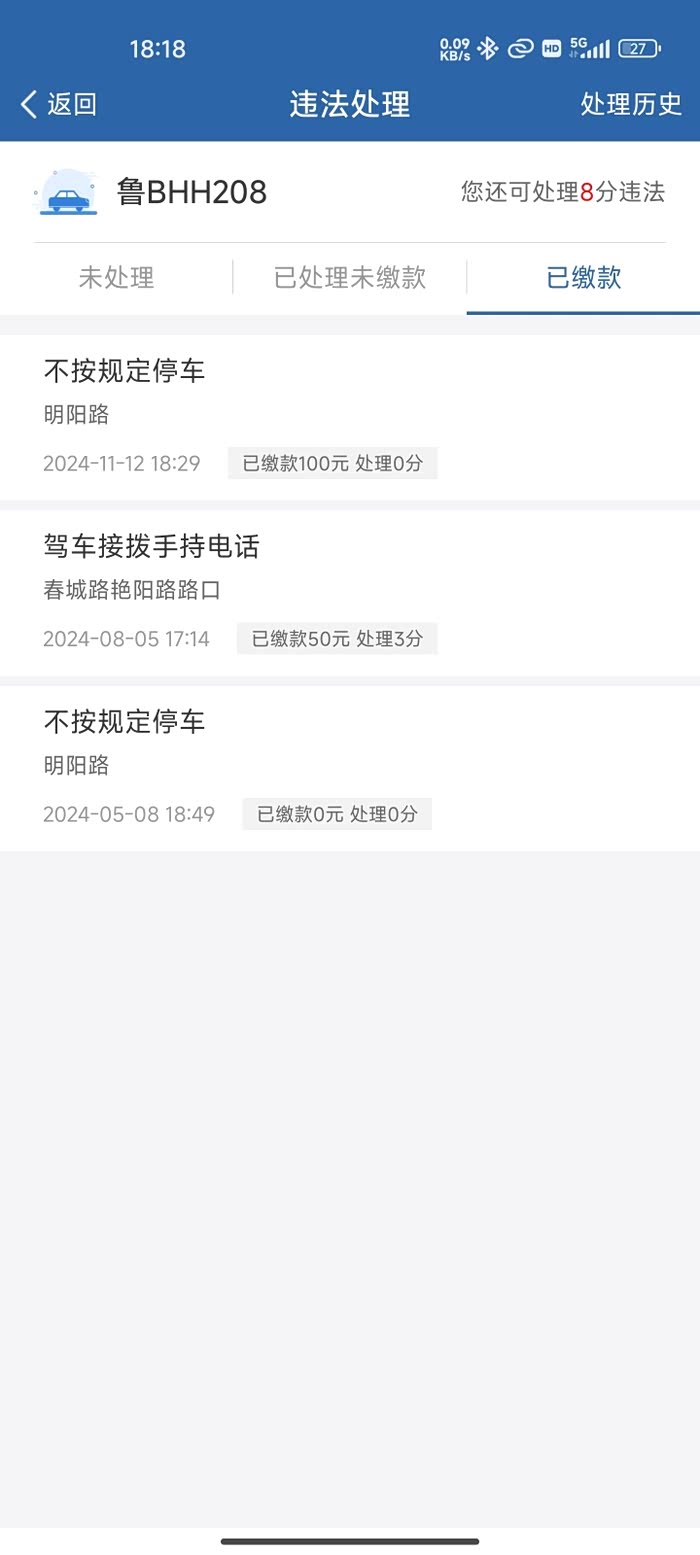 违章罚款:150元。驾车接拨手持电话那个确实很尴尬,平时开车都用车载蓝牙,那次也不是接打电话,就是开车无聊了,拿着手机杵着脸,结果50元没有了。不按规定停车没有办法,晚上接孩子放学,上楼接孩子不到3分钟,100元交给国家了