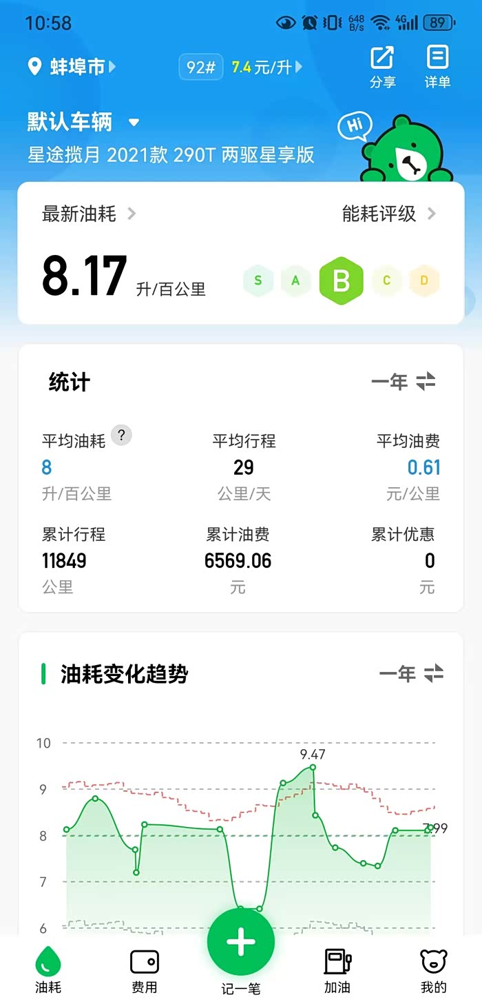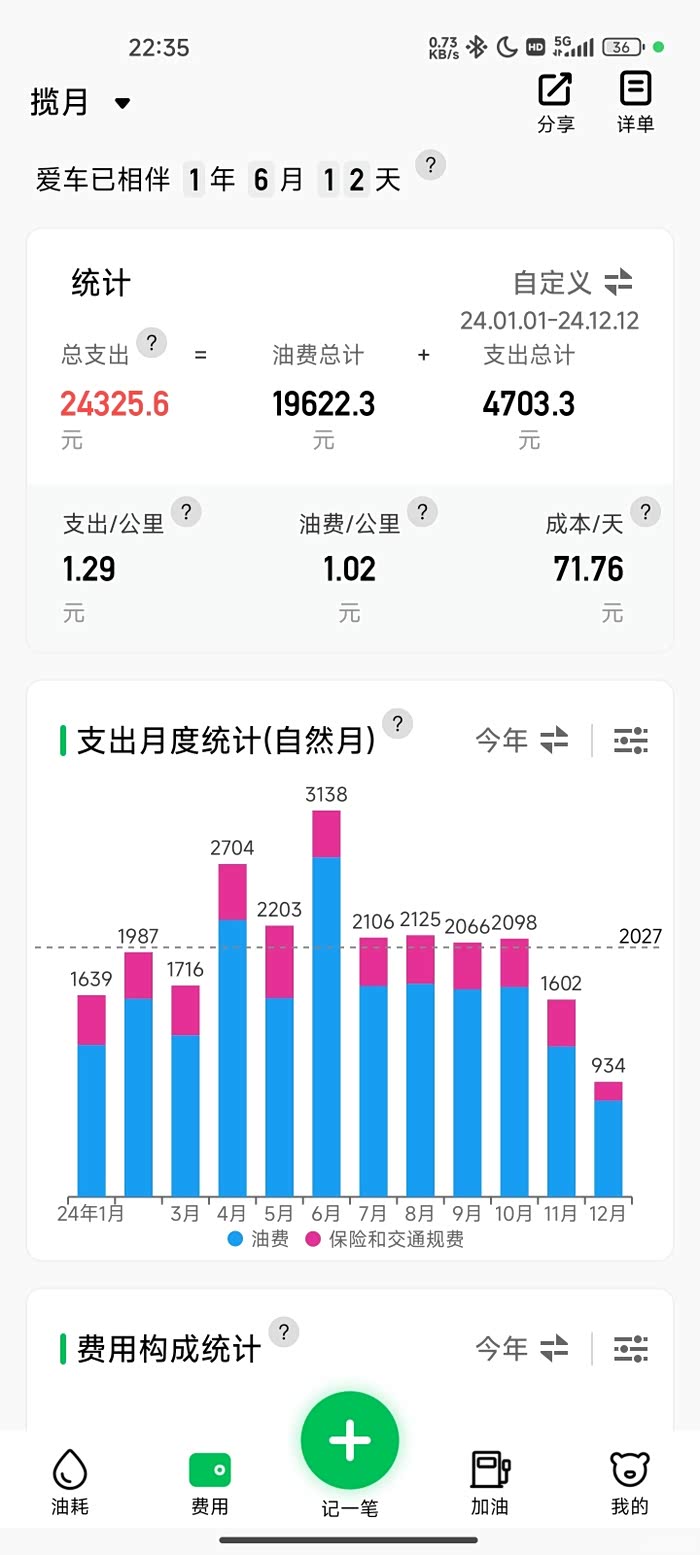 油费:19622.29元。最近天冷了,每天出门前提前热车10分钟,最近油耗有点高。不过一年下来平均1.02元一公里,感觉还可以接受。我常去的这家加油站不是两桶油,这家加油站从我第一辆车就开始在这里加油,加了六七年了,油品不比两桶油差,比两桶油便宜六七毛吧,主要是上下班会路过,不用绕路加油。