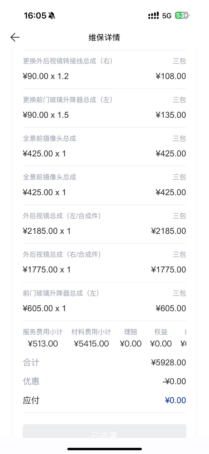 费用清单:摄像头配件费:0元(厂家保修期内免费更换)。 人工费:0元(保修服务包含)。