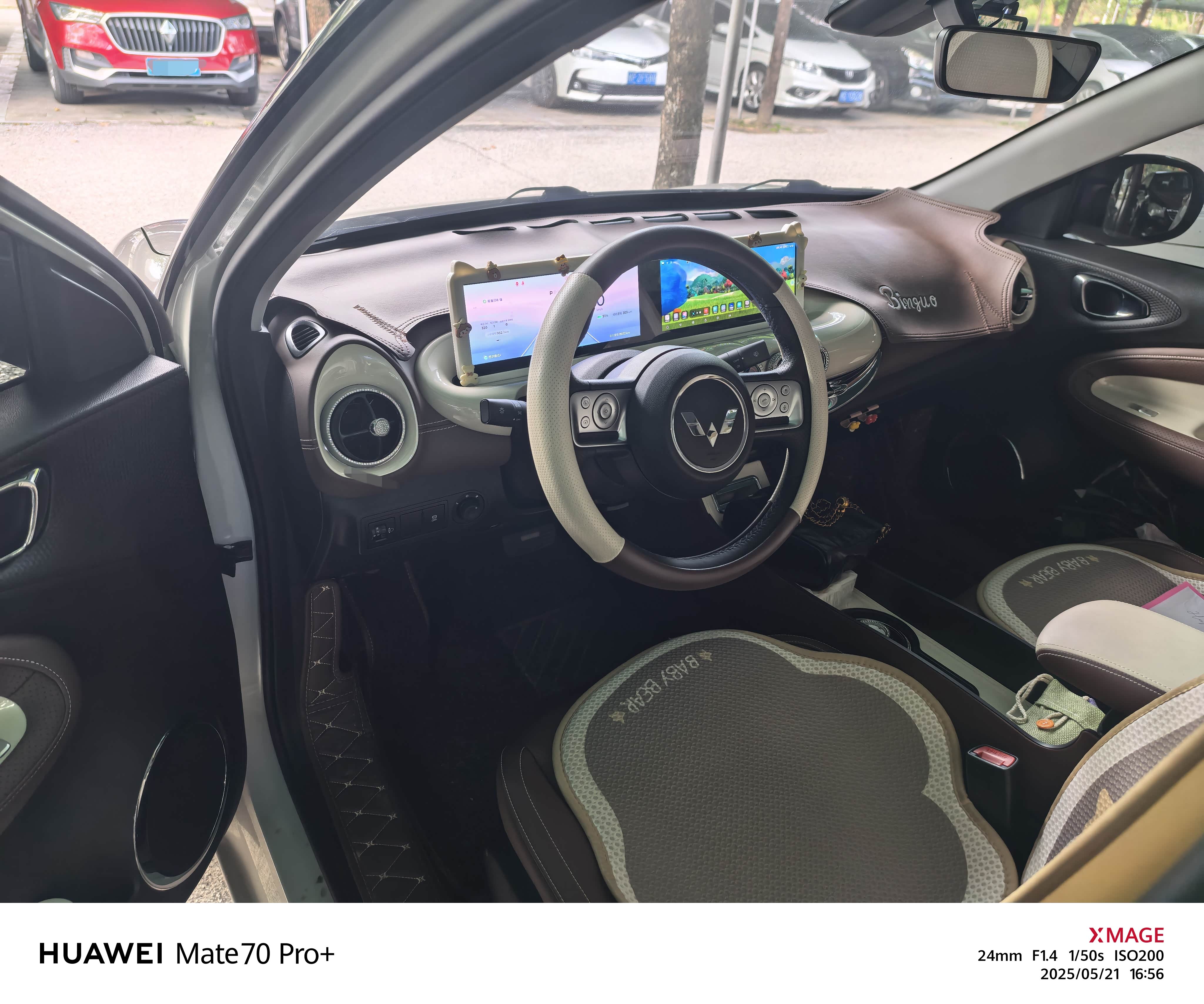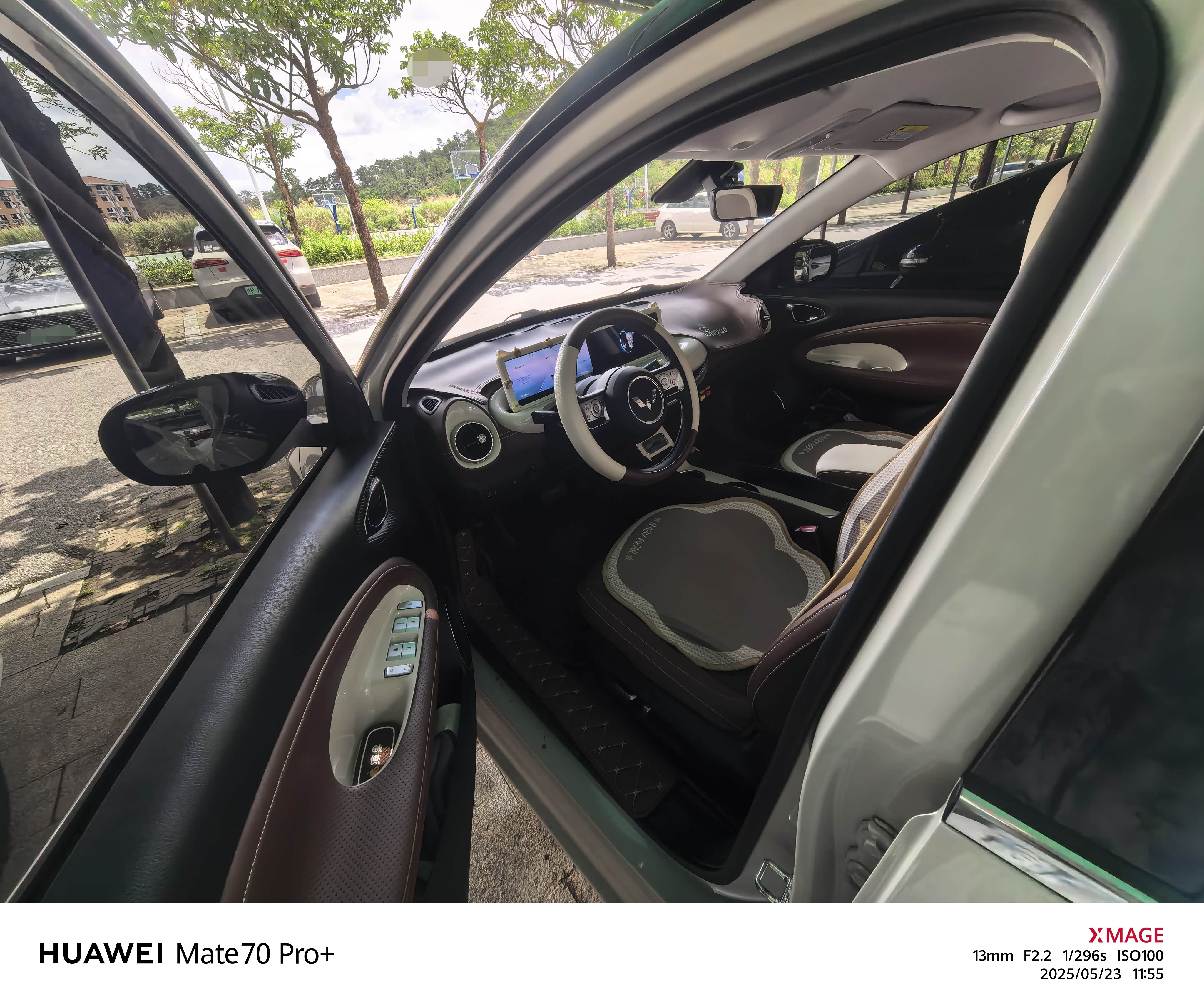 ❤️颜值与氛围:精致实用派:复古圆润的造型,X型水影LED大灯,搭配我选的奶咖白,颜值在线,在小区或停车场辨识度很高,常引来邻居或路人询问。内饰采用双拼色设计,双10.25英寸联屏(仪表+中控)提升了科技感,旋钮式电子换挡节省空间且操作顺手。虽然材质以硬塑料为主,但做工在同价位属于良好水平,没有廉价感。(配图14:车辆前脸/大灯特写;配图15:内饰全景/双联屏特写)