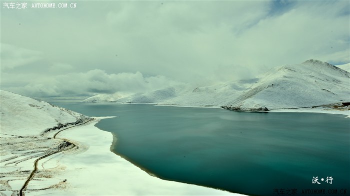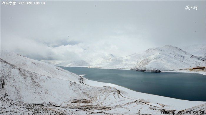 满天飘雪,加上大雾,在山顶完全看不到羊湖真面目,继续前行,雪停了,雾散去,羊湖露出真面目