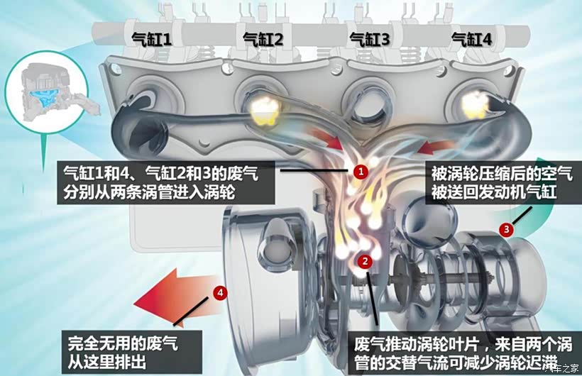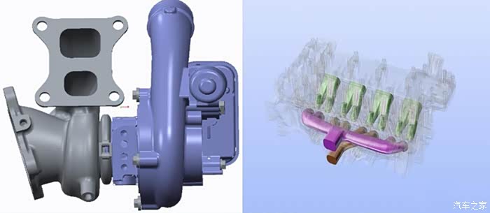 这台代号为JF473ZQ7的1.5T涡轮增压发动机,我们可以把它看成是1.5代的NE蓝鲸发动机,因为这台发动机采用了全新电磁控制式双涡管涡轮增压,该技术能将增压后的空气由两根进气管输送到气缸内,大幅度避免气缸之间的进气影响,造成的某个气缸进气不足。此外,集成式缸盖式排气系统也采用了双口设计,能够避免排气之间互相干扰造成的排气不通畅,降低涡轮迟滞,同时带来更强的动力性和平顺性。