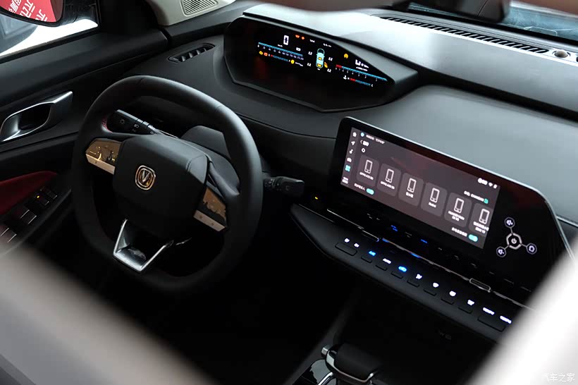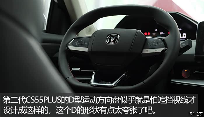 说到不遮挡视线,第二代CS55PLUS的D型运动方向盘似乎就是怕遮挡视线才设计成这样的,这个D的形状有点太夸张了吧,而且方向盘的位置也比较低,在坐姿很高的SUV车里,这个方向盘有点抱着开的感觉,真有点怪怪的。