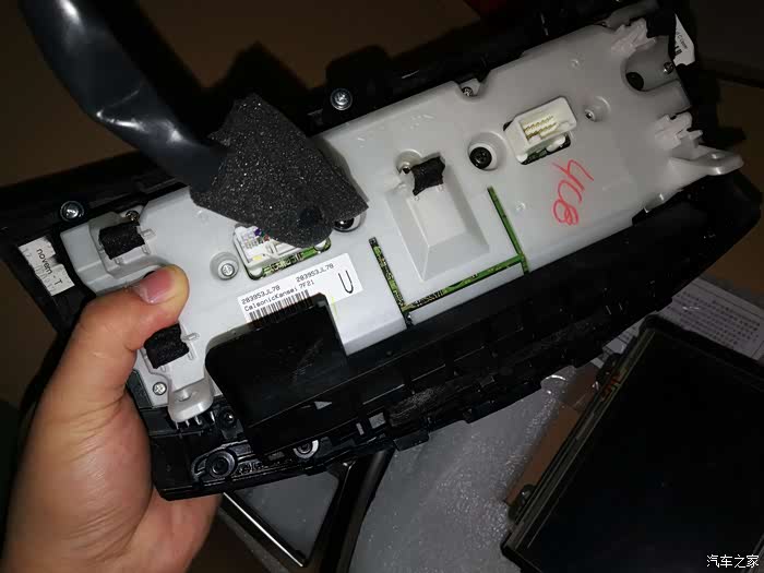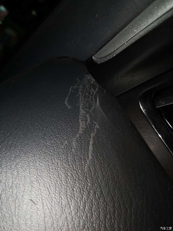 然后就是把导航试好在复原,这次我就是这个耽误时间了,因为贴的车膜是金属膜,导航天线信号被屏蔽的厉害,一开始总是搜不到星,甚至以为导航模块坏了,后来换了一个天线,再把天线头放在前挡风玻璃下才好,中间反复拆装这个大屏,导致了另外一个问题,就是大屏上边缘很锋利,反复拆装把仪表盘靠近大屏的面板刮花了!如图