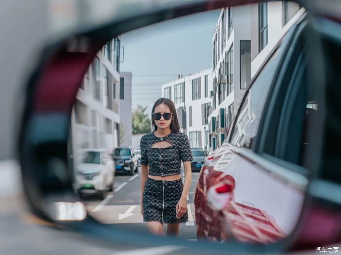 在拍照时,要善于发现和利用身边一切可以为摄影所用的物品。所以在拍摄人车的时候,就要学会结合车身的特点来拍摄。例如利用QX55的车窗、前挡风玻璃、后视镜等为框架进行拍摄,将人和车相融合。因为QX55明亮张扬的红非常衬人,顿时让我生出一种豪门千金霸气归来的感觉