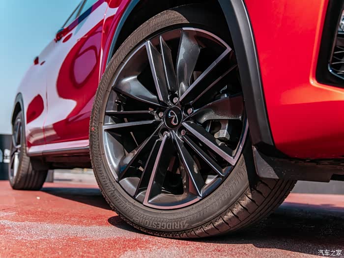20寸的金属灰轮毂造型锐利锋刃,强悍的运动气息呼之欲出。而且轮胎行驶途中产生的胎噪一点也不明显,当然这要归功于QX55有着极佳的隔音静谧性,一是双层结构的前排玻璃可以有效降低汽车行驶中的外界噪音。