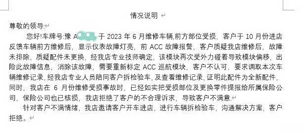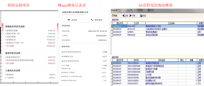 对比 手机魏app维修记录 、 4s店发给我的维修记录 、 保险定损记录, 2023年6月9日这次事故维修 发现这其中大有猫腻,他们4S店再维修时本来应该更换新的配件:巡航传感器模块(1960元 )根本就没有更换 只是对我的巡航传感器模块进行了维修,通过我后面和4S店里面工作人员的沟通也由他们亲口承认:巡航传感器模块 及支架均未更换,只是进行了维修。而我有相关的录音及证据,如此看来维修不彻底只是一方面,他们4S店竟然还再配件上弄虚作假。后续查到的几次维修中均出现几种配件,一千至两千的金额不等,可能这点钱也并不多,可是既然被发现了 他们还能那么理直气壮的,实在令人气愤。
