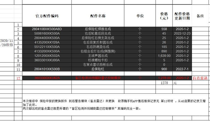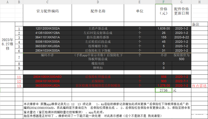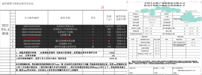2023.6.9号维修记录、保险定损对比:巡航传感器被黑心狗偷吃了;