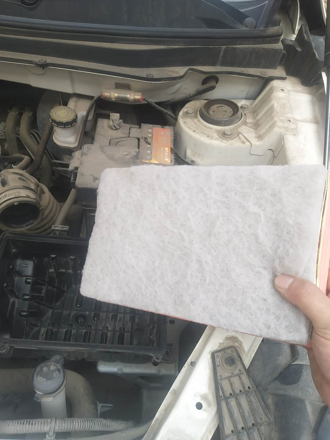 今天天有点热,就打开空调,可风量实在的太小了,以前开到最大,眼睛都吹的睁不开,现在感觉就没有一点风,想着是不是风机的问题,因为感觉空调滤芯看样子还不是很脏,想了想还是先拆下滤芯再说吧!去掉滤芯后打火开空调试了一下,我⊙?⊙!风真大,还是这个滤芯的问题,因为没有新的,只能清洗一下了,把以前换下的原车的滤芯拿过来,一般这东西我都不会随手丢掉,而是放起来