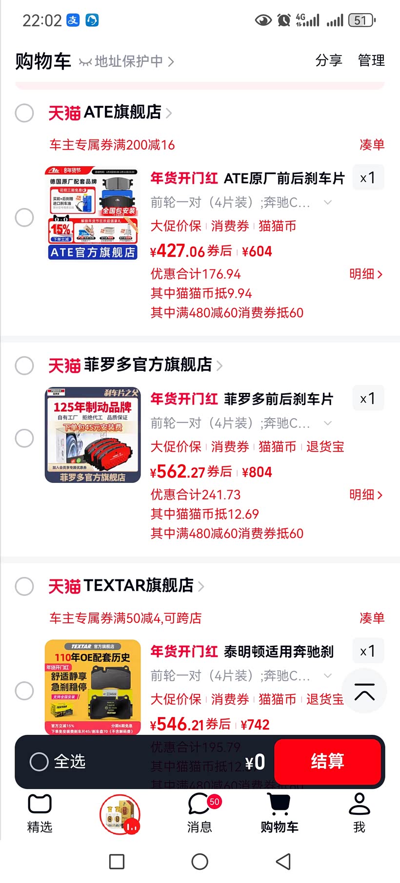 老规矩,上天猫去买材料,以前后轮刹车片买的菲罗多的,谁便宜买谁,只要是大品牌都没问题,在菲罗多、泰明顿、ATE之间选择,之前是菲罗多最便宜,这次发现ATE最便宜,四百多块钱就能买到一对前轮刹车片。4S店貌似要1600