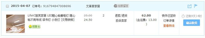 经过在某宝上筛选,选到一款LED橱柜灯,3节7号电池可以连续照明18个小时,