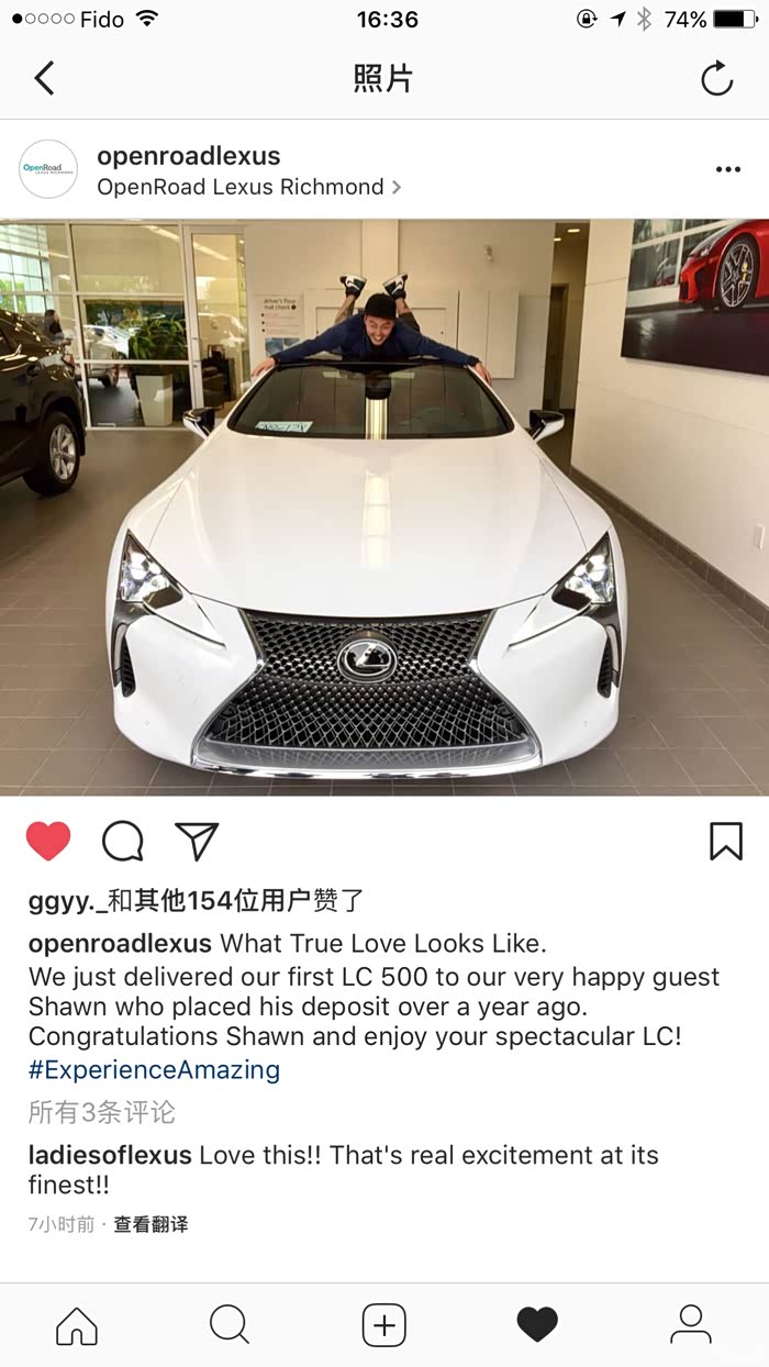从第一天提车到现在准备分享这篇日记给大家已经开了1个多星期了。温哥华时间5月30号下午办完所有该办的手续,终于有了人生中第一辆自己的车,也是我梦想车之一。我其实不是很早了解到这辆车的,去年给家里的一辆奔驰做保养得时候,旁边恰巧是雷克萨斯的店。本来进去是想咨询RCF的(当时觉得RCF也是很吊的,不管从外观还是动力来说,人家至少是V8的啊,还从来没开的这么大排量的车)后来跟一个销售继续闲聊的时候,无意中发现他桌子上有一本LC的宣传册,说实话当时我还不知道有这款车。当我翻开看几页的时候,真的不骗大家,第一眼就爱上了这车,不管是从外观还是内饰完爆RCF。本人其实是外观和内饰控,当时还考虑了新帕拉梅拉,觉得里面内饰的触摸屏也很富有科技感,而且后坐也宽敞,后备箱容量也大。但是保时捷的销售跟大爷似的,一副爱理不理的样子,而且想到以后很有可能会是街车,瞬间就下决心了(其实还是LC比较帅,作为一位外观党,LC的外观真的深深的刺激到了我的神经!!)朋友有一个M4,每次他回国就把车放我这里,有时候拿来“操两脚”。本来父母不想让我买类似于M4这样的小GT跑,担心我毕竟还年轻,不够稳重,喜欢开快车。这些担心其实都可以理解, 但当我把LC照片给他们看之后,他们也都觉得外形很漂亮。原来家里有一辆12款的RX350,这款车不管是开还是坐,他们都觉得很舒服。再凭借着我的三寸不烂之舌,说什么雷克萨斯只有舒服,内饰人性化,动力一点都不强,开不快。最终他们被我说服了,我也毅然决然的去交了定金!!!!