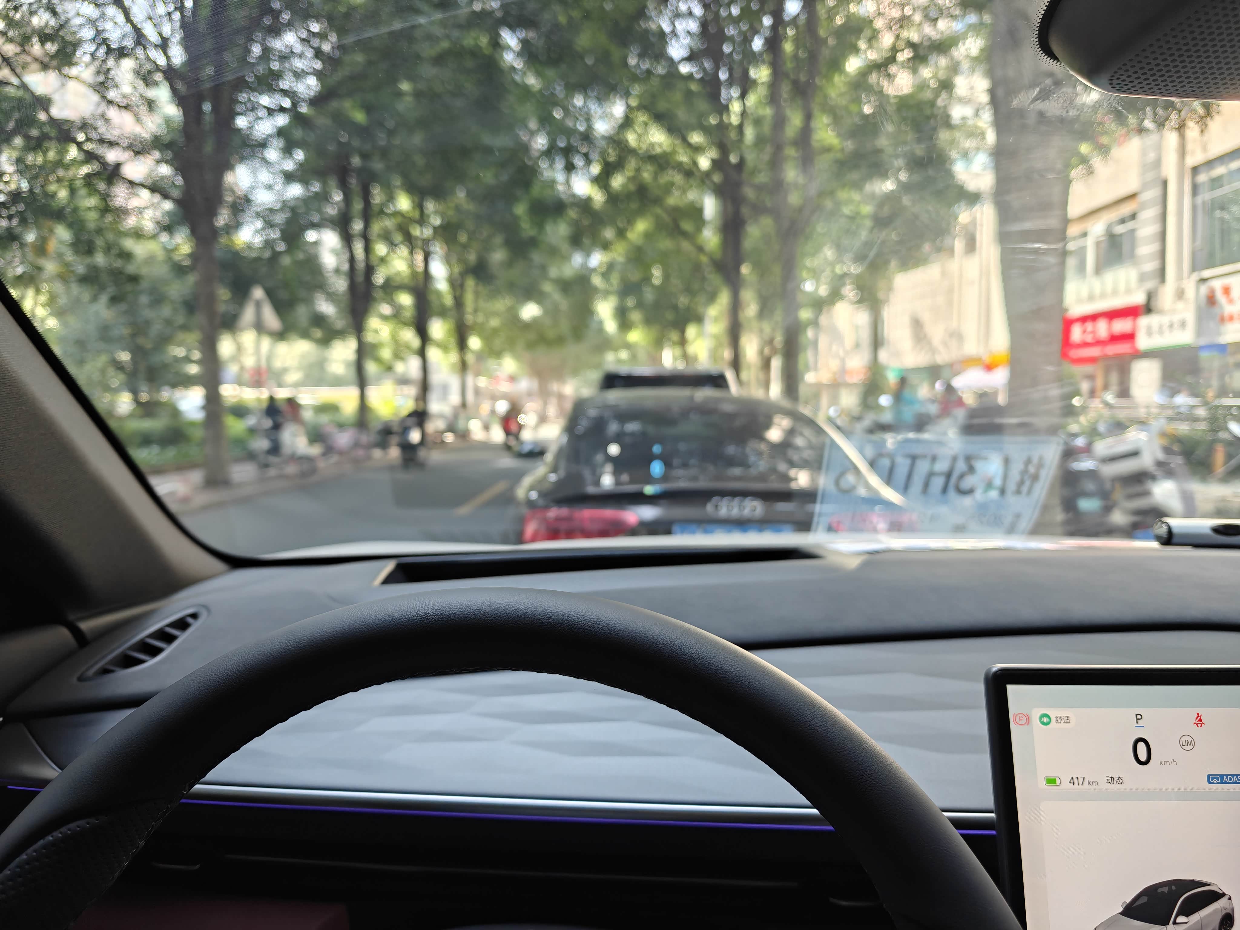 提车后基本都是我在开,老婆只偶尔开了两次,还念叨着“转向真轻,比家里之前的车好操控”。这一周开了110km,驾驶感受远超预期:转向精准无虚位,过弯时车身侧倾很小,稳定性不错;过减速带时底盘滤震干脆利落,没有多余颠簸,连小区门口那段坑洼路都能平稳通过;车内静音效果也出色,高速开80km/h几乎听不到明显风噪,只偶尔有轻微的胎噪,日常通勤很舒适。加速线性平顺,踩多少有多少,完全没有纯电车常见的“窜动”感,就算是新手开也不容易出错。