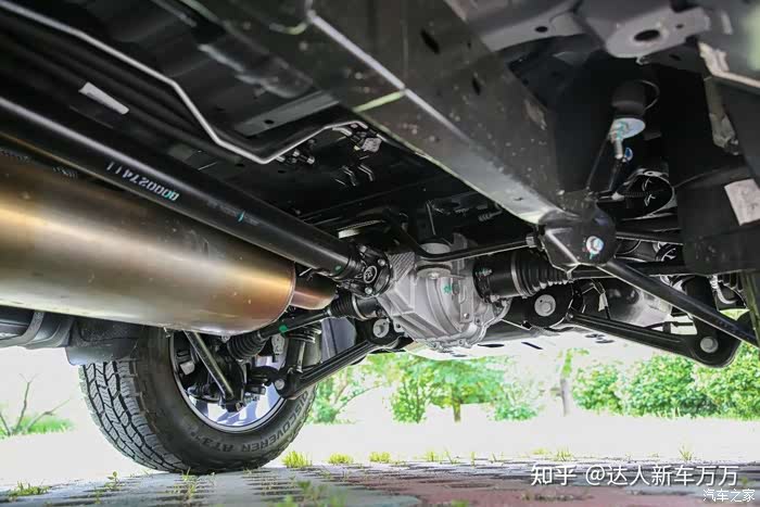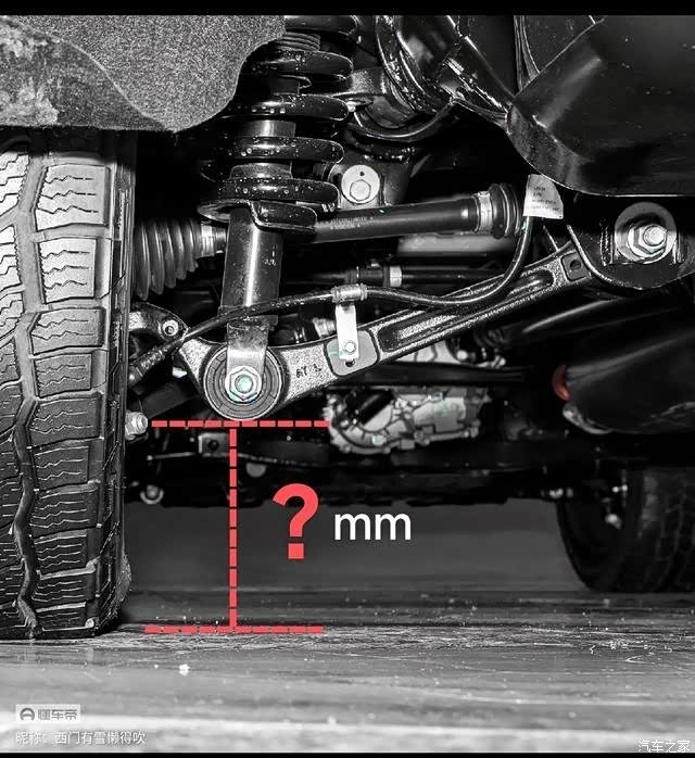 其实这套后悬架让我真正担心的还不是图中打“?”的离地间隙,毕竟不管是独立悬架还是整体桥,这个位置的离地高度其实都差不多。我所担心的是那个地方距离车轮的距离是不是有点太远了,如果是普通的烂路行驶,甚至是沙石搓板路行驶,这个位置应该不会有太大问题。但是在纯越野路况,或者说地面有较高不规则障碍物以及起伏时,这个位置是存在托底可能的,甚至更严重一点,是有可能受到纵向猛烈撞击的。