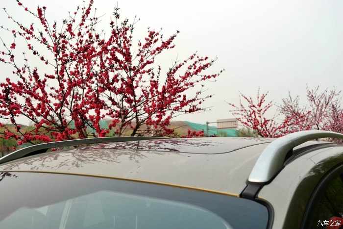 不得不说,金色的车漆还是很光亮的,映衬的桃花很清楚。
