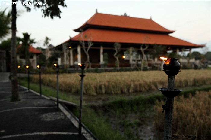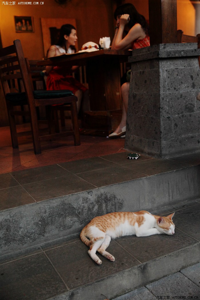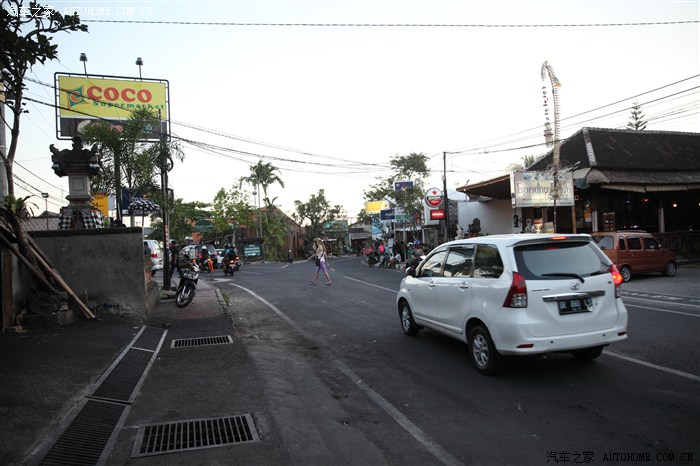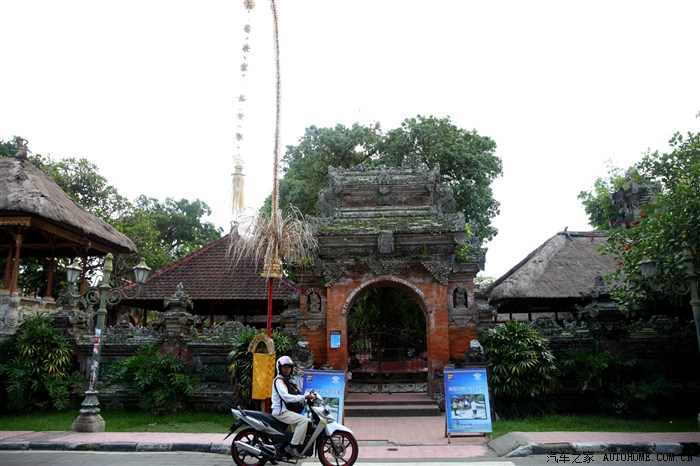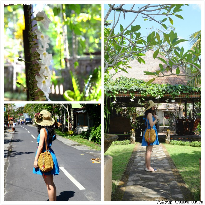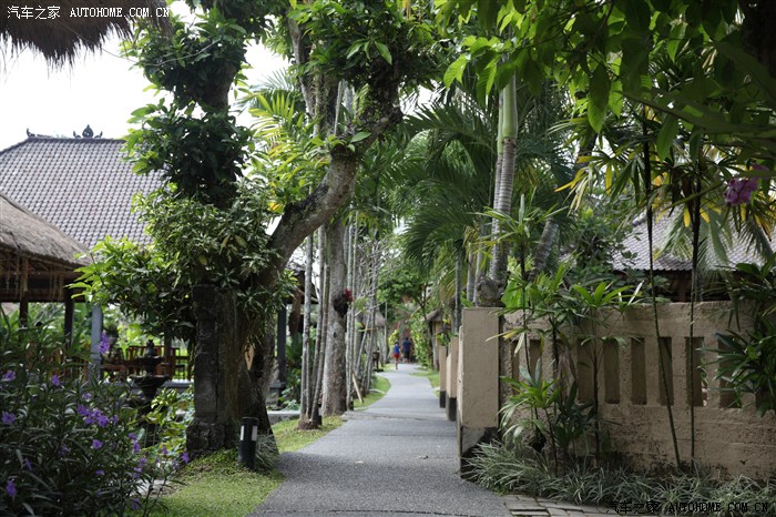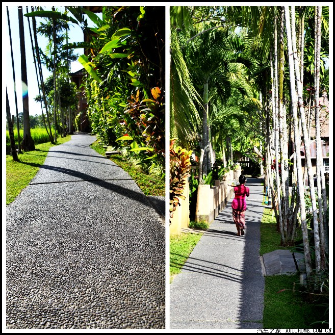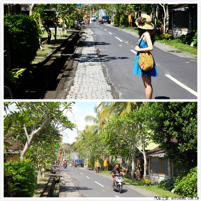 餐厅外的马路,乌布的马路都很窄,只绒辆车通行,甚至有些地方,会车的时候,必须等另一方的车过去了,才能走,但是这里很少堵车,大家都是很有秩序的排队,插队的现象根本少见。路虽然窄,路况却非常的好,不会像我们这里大坑小坑落玉盘。