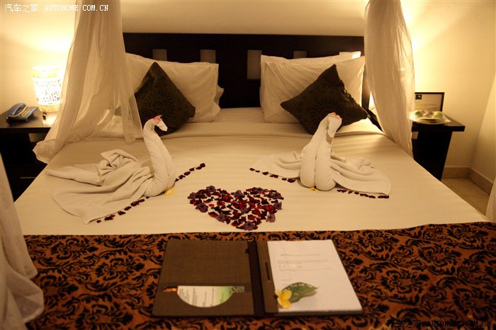 很有爱心的把我们的浴巾叠成了两只天鹅,床上的花瓣已经有些许枯萎,但不难看出它们在这里已经等候了我们一整天。