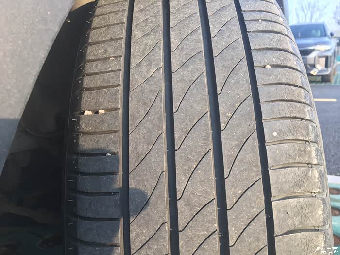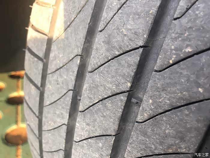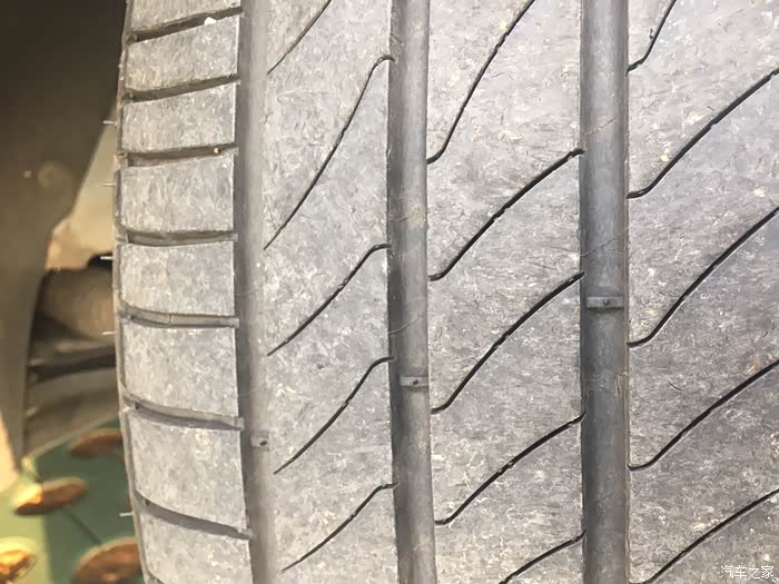 今天我发现,其实根本不需要测量,因为我居然看到了这些磨损标记表面的胎毛居然是完好的。我的车已经开了4.4万公里,这些胎毛说明磨损很少。如果看车辆读数,胎面凹槽的深度有4mm左右。