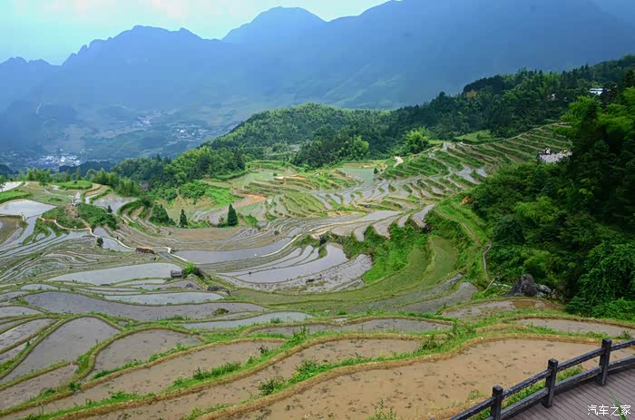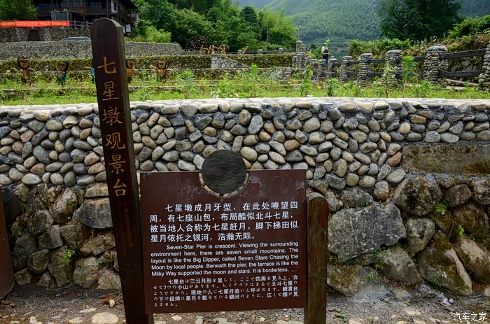 七星墩观景台:这是一个月牙形观景台。下面就是白银谷,远处就是坑根石寨。白银谷两边都是层层叠叠的梯田,谷中有七座小山,石板铺成的游步道在白银谷中穿行,好象一条白色的丝巾随风舞动。整个白银谷像是一只盆景,重现了“七星赶月”的天文景观。