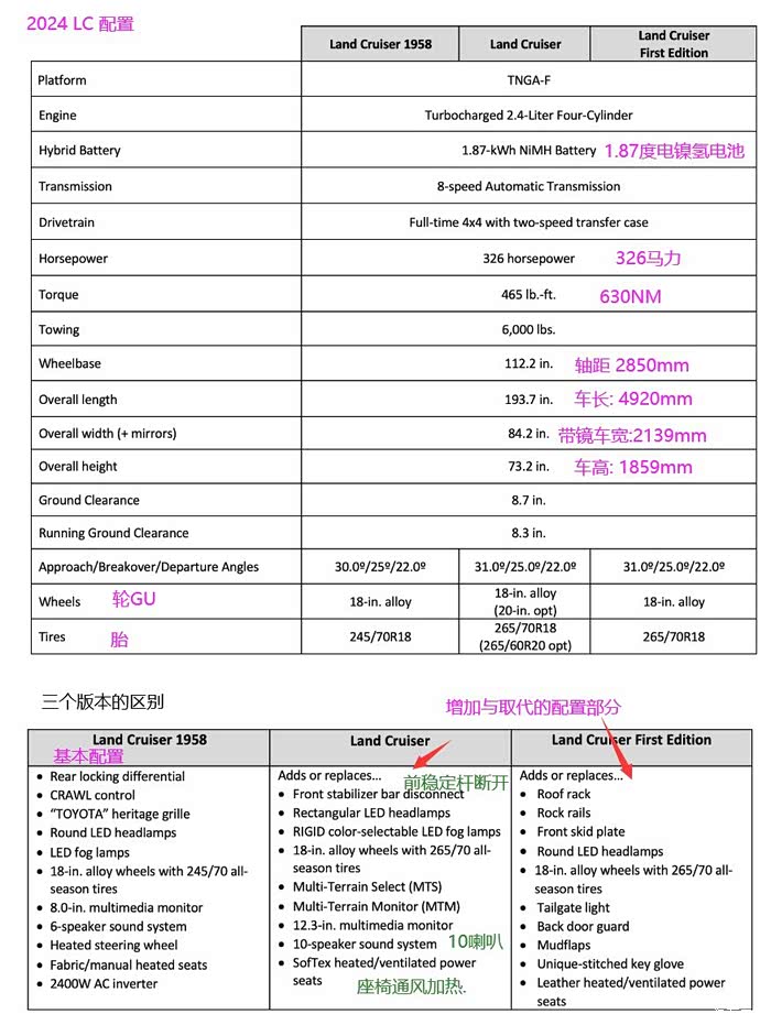 新发布LC 2024款. 轴距与LC300一样, 2850mm, 配置更高. 对比一下长度与高度如下. 如果大小差不多, 但平行进口贵一倍到二倍, 大家还会考虑?