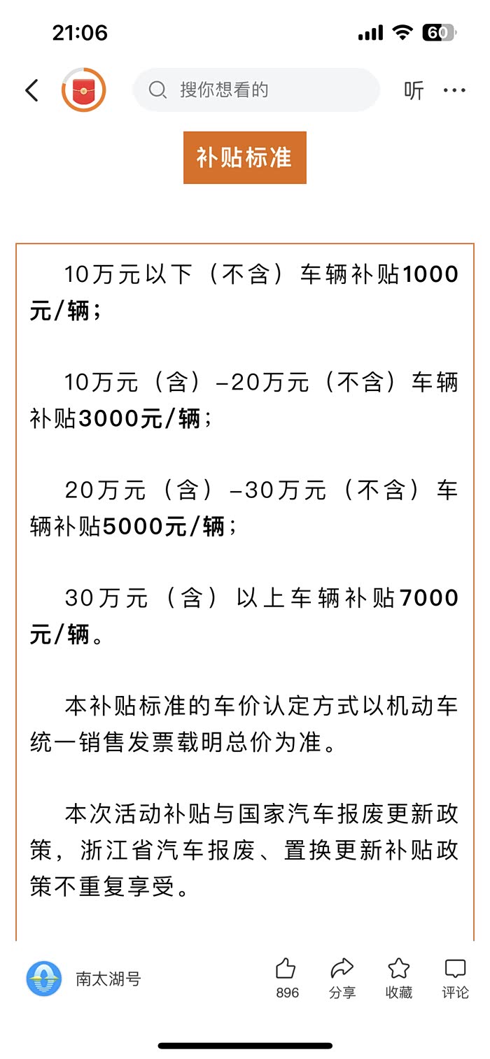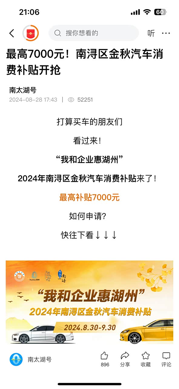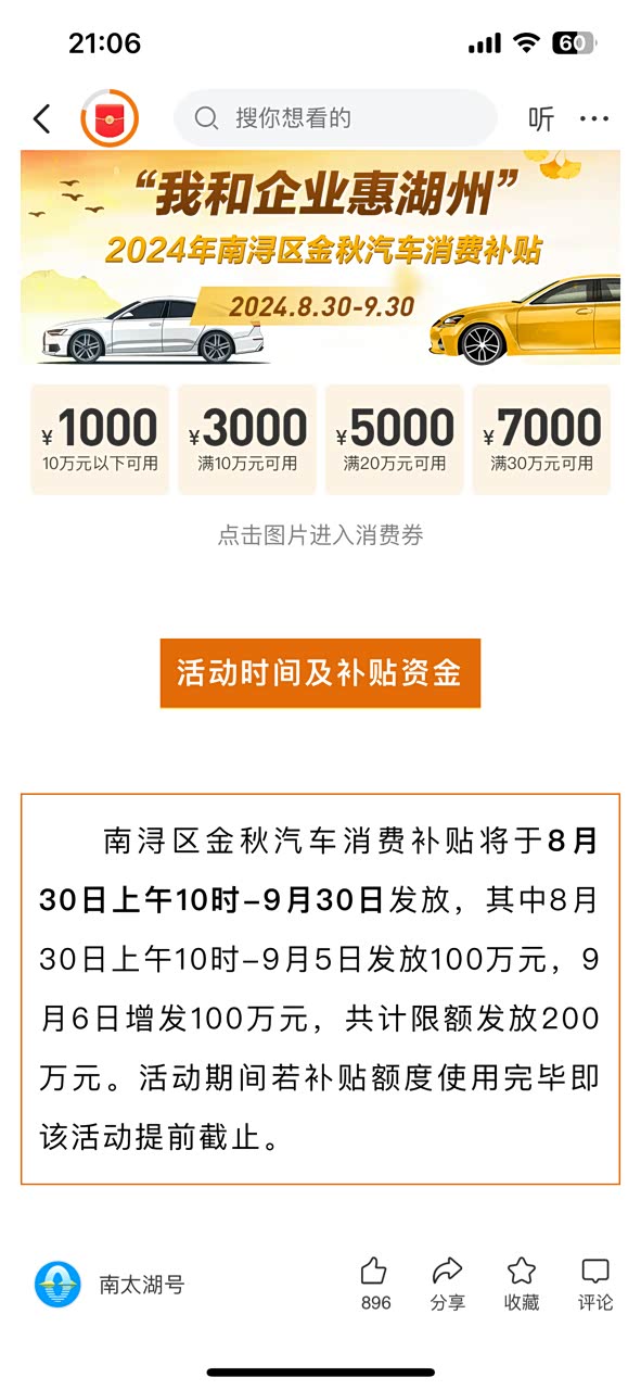 最高补贴7000元。南浔区金秋汽车消费补贴将于8月30日上午10时-9月30日发放,其中8月30日上午10时-9月5日发放100万元,9月6日增发100万元,共计限额发放200万元。活动期间若补贴额度使用完毕即该活动提前截止。
