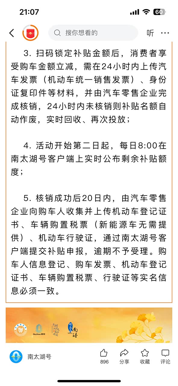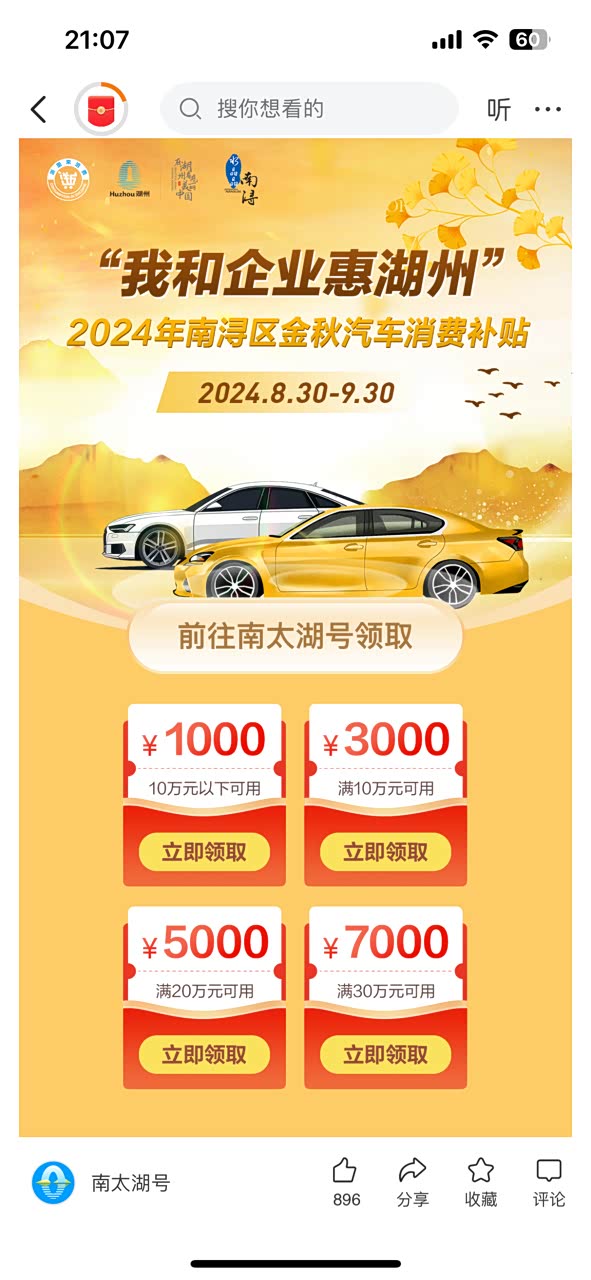 具体领取办法:下载“南太湖号”APP,打开APP进入服务项,就会看到“消费券”,点“消费券"进去,就会看到了,在规定的时候去抢券就可以,如果已经选好了车型,就让销售把店码截图发过来,扫码后领取到的金额券,就可以到店直接抵扣车价了。