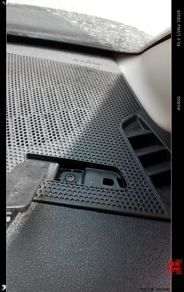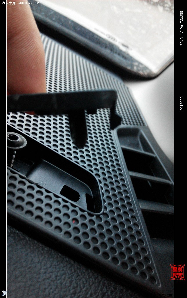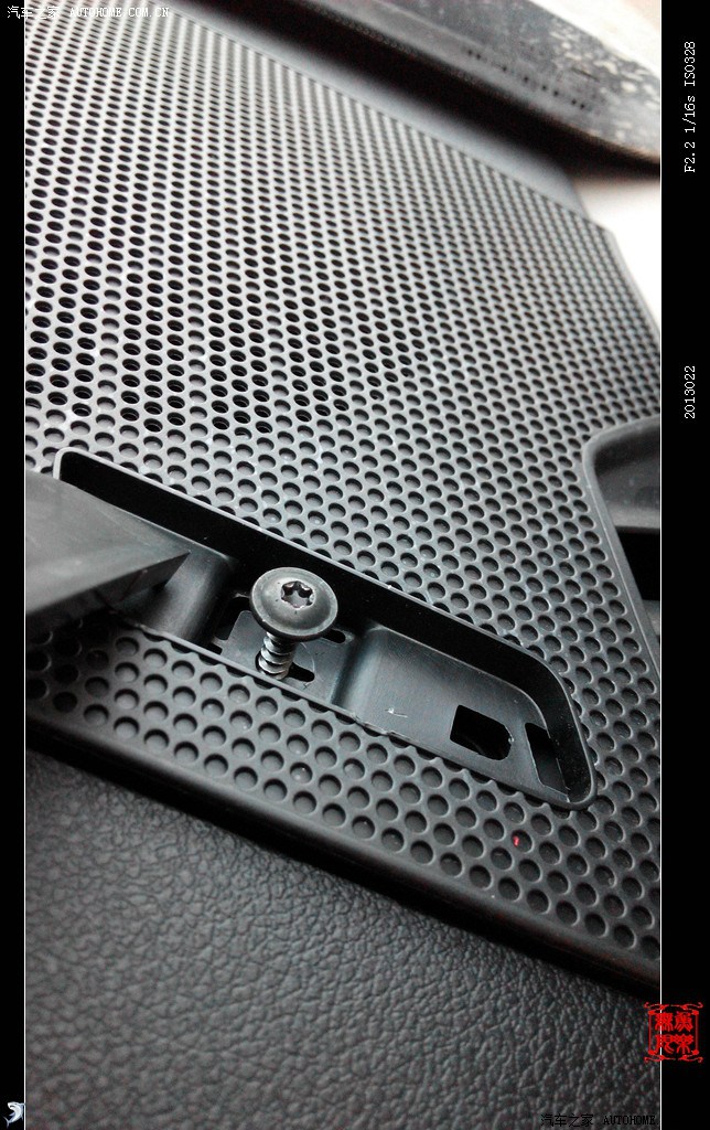 注意 右侧副驾网罩上有一个固定螺丝。如图打开黑色卡盖,须先卸掉螺丝再撬网罩,切记
