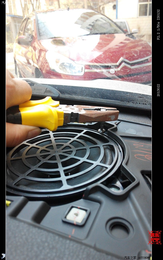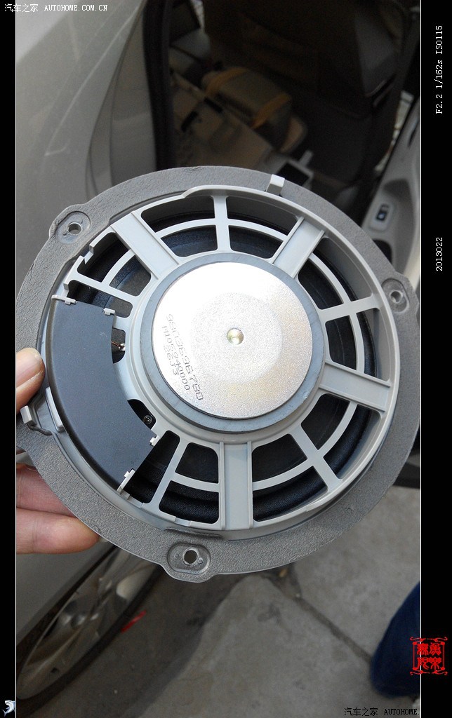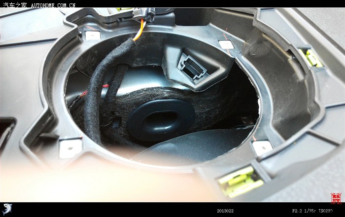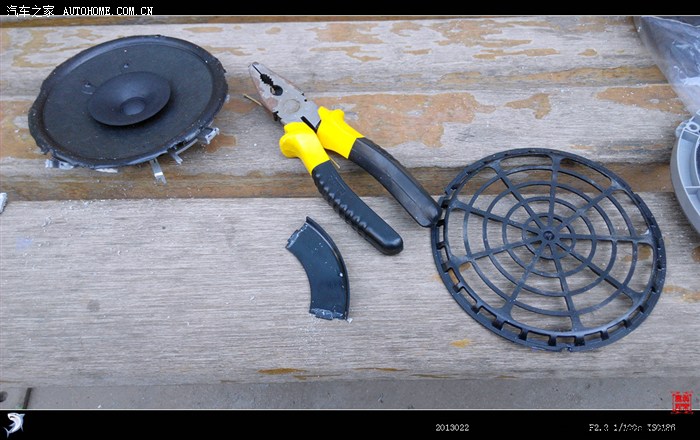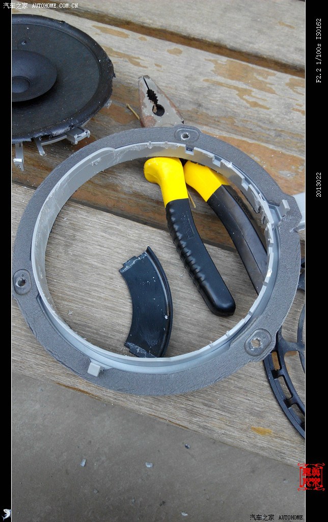 开弓没有回头箭,经过漫辛思考后,决定废弃原车喇叭,只留边子使其固定喇叭。在此说明一下,如有更换喇叭的车友拍喇叭时最好再拍一副木质喇叭垫圈,抬高喇叭位置,以解决更换喇叭后、开关后备箱时拉杆碰喇叭磁缸的问题。