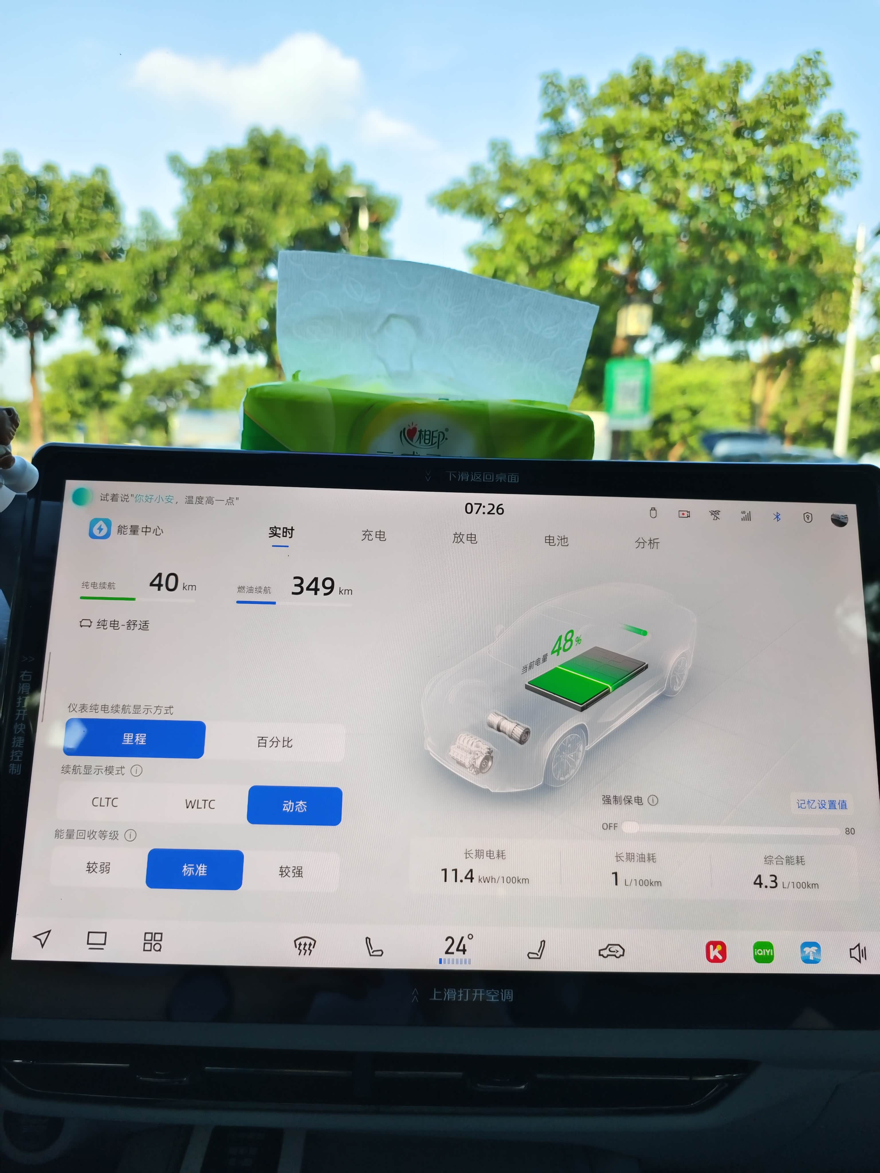 智慧能量管理:在高速和快速路行驶时,开启混动模式后系统会智能分配能量。一般都会先优先使用电,然后速度快的话就会燃油介入。