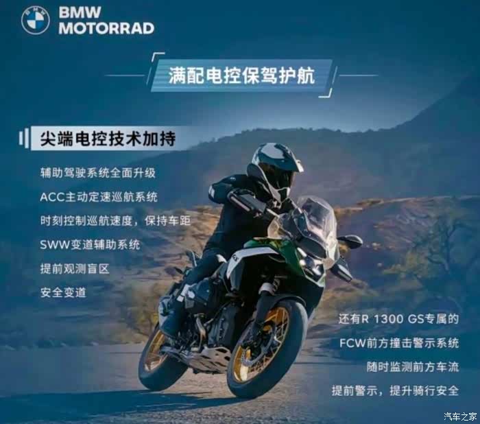 论配置,这台R1300GS也将成为未来的新选择,新增加了雷达系统,支持智能适配巡航驾驶,为骑手的安全提升了升级的空间,同时也作为全新的设计,这台车的元素更加偏向于冒险风格,前大灯采用X型组设计,整车的犀利感也提升不少,尽管宝马的GS系列拉力车深受大家的喜爱,主要还是得益于宝马的高端配置与它的对平对置经典发动机。