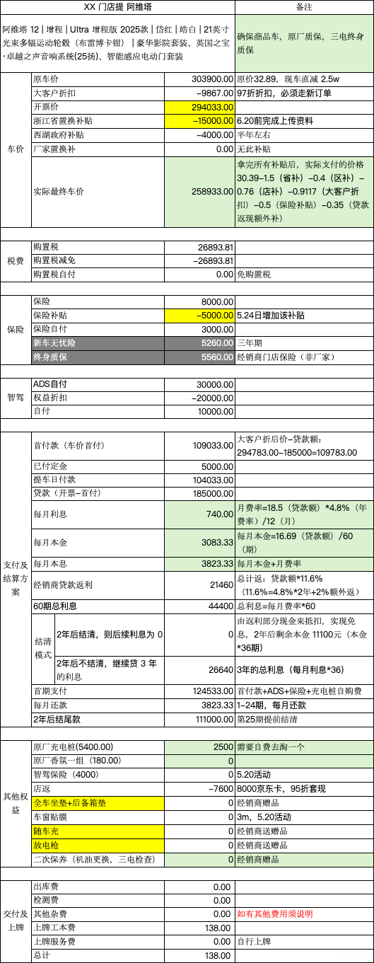 这样的表格,把你所有能拿的优惠,能做的方案,全部算得清清楚楚,买车的花费也是提前做好准备