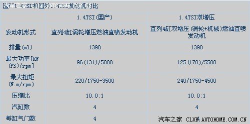 现在大家明白了,国产的1.4TSI发动机实际上就是涡轮增压缸内直喷发动机,只有一个增压涡轮和一套缸内直喷系统,并不是先进的双增压TSI发动机。即便如此,它还是一款高性能发动机,这一点从仅为1.4L排量却能爆发出与2.0L相当的动力数值就能看出,这也正是很多消费者感到惊奇的地方。