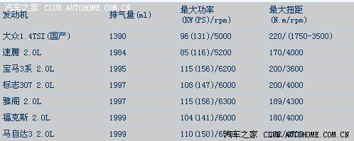 从表中参数不难看出,1.4TSI发动机的最大功率和最大扭矩都几乎达到了目前市面上主流2.0L自然吸气发动机的水平,扭矩超过了所列的所有发动机。