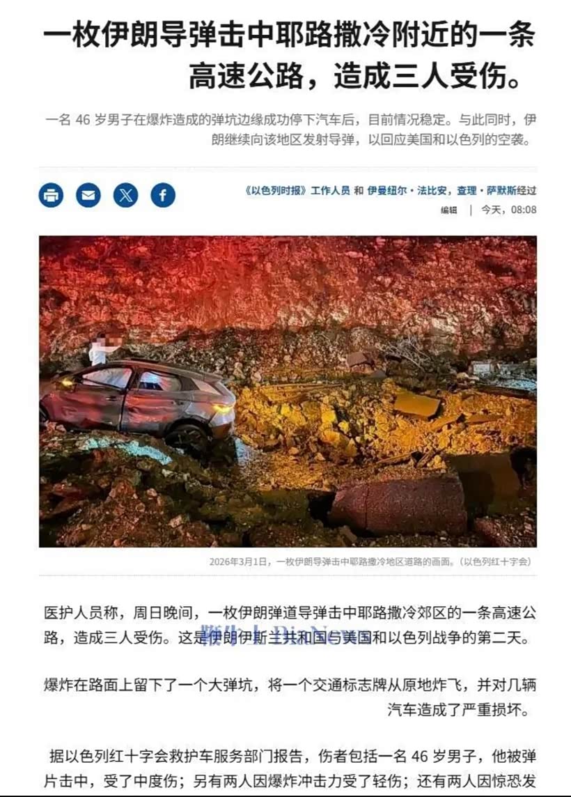 3月1日,中东局势升级背景下,一枚来自伊朗方向的导弹在耶路撒冷周边发生爆炸。根据以色列时报等媒体披露,爆炸在路面形成明显弹坑,周边多辆车辆受损,交通标识被掀翻,冲击波威力不小。