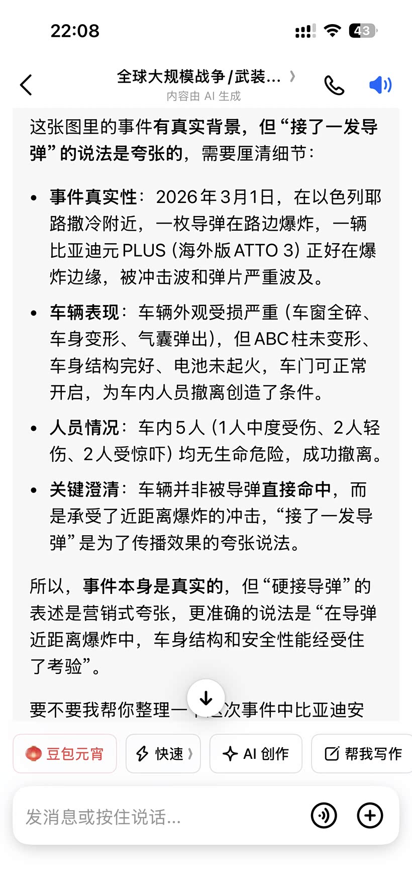 但也要冷静一点:战争环境是极端偶发场景,单一案例不能当成“绝对安全”的证明。汽车安全从来是概率问题,而不是神话。