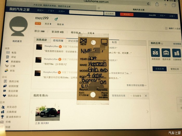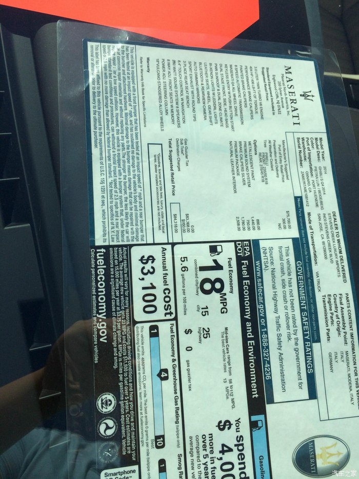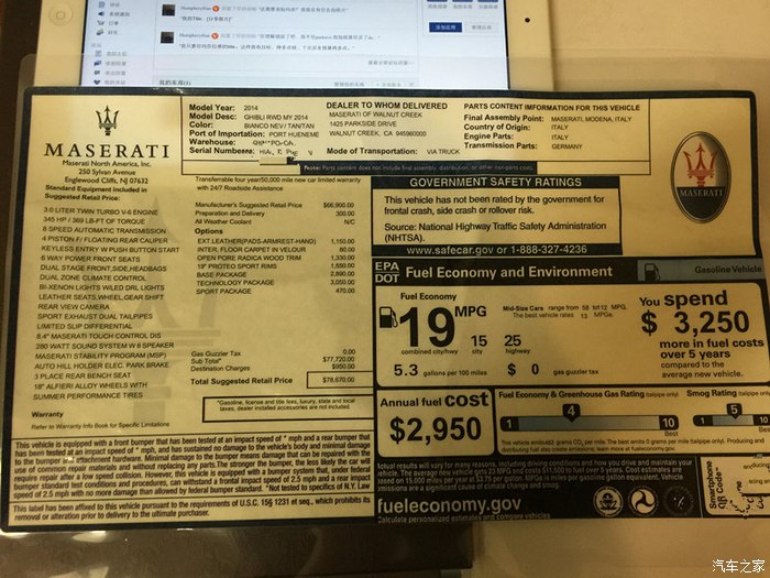 选定完车型后就在各大车行里面选配置,砍价格了。 我们这附近有5家玛莎拉蒂的4S店,当中差点被骗提一部木有打孔碟的小G. 在论坛得知2014年后些版本开始所有的GHIBLI都是打孔碟,我就一直在找。 可是我们这边貌似都不是前6后4. 然后就开始了