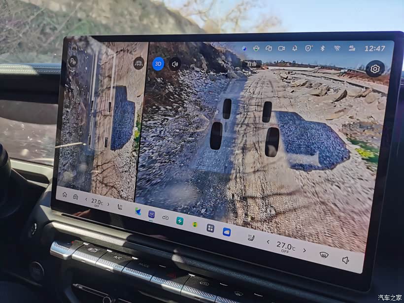 出发前还特意研究了车辆参数,2.0T 发动机,222mm 的离地间隙,再配上265/60 R18的大轮胎,心里多了几分底气。在碎石路上驾驶,可以打开底盘透明功能,屏幕上清晰呈现车底路况,就像给车辆装了“透视眼”,我也能精准避开几块凸起的大石头,彻底打消了刮蹭底盘的顾虑。