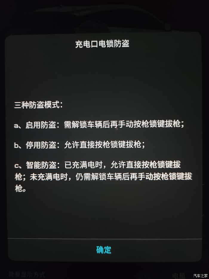 唐DM-i的充电枪充电状态一共可以设置三种防盗模式(其实就两种,因为有一种是不防盗状态)。