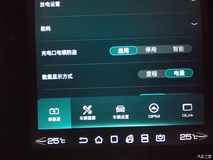 首先在车机多媒体左下角点击小车车图标,然后进入最左边的新能源图标,然后向上滑动,找到充电口电锁防盗设置选项就可以进行设置。