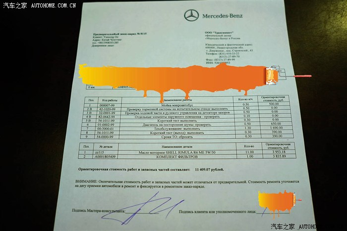 天下奔驰一样贵,更换吊脚轴承加上更换三滤一共花费23325卢布,约合4665元人民币。交费时还颇费了一些周折,这家4S店第一次接待中国用户,居然不敢刷中国信用卡,估计是担心卡上没钱。唉,可惜我们手里的现金又不够,没办法,只好由4S店安排专车去下诺夫哥罗德的银行取现。来回折腾了一个小时,取现后才把账单结掉。
