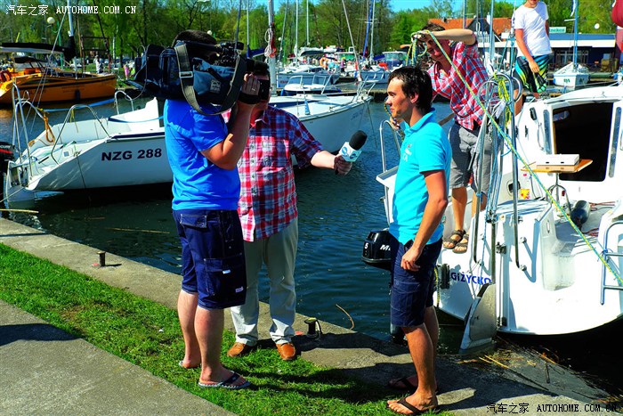 电视台的记者正在岸边采访一艘游船上的年轻人。