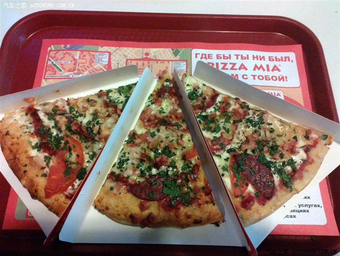 参观完军事博物馆后准备离开叶卡捷琳堡,出发前在一家名为PIZZA MIA的披萨店吃了一顿午餐。一份切好的披萨合人民币只有几块钱,索性点了三个不同口味的披萨一一品尝。这家披萨连锁店在车里雅宾斯克和叶卡捷琳堡有几家分店,值得一吃。