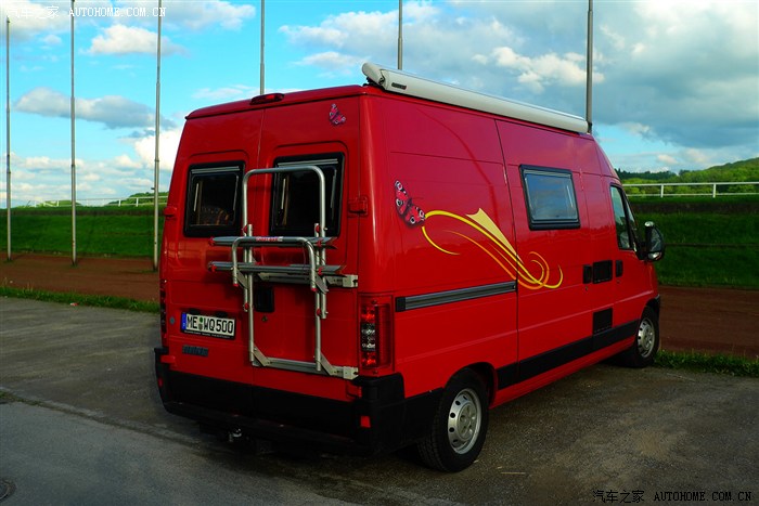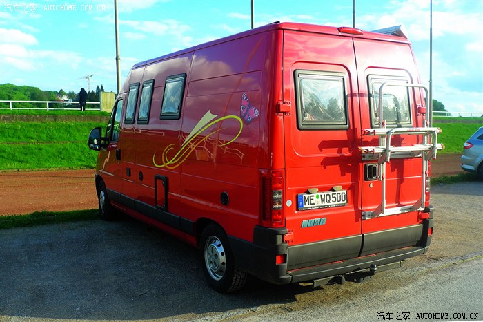 停车场上发现的一辆自行式房车,关注点是在随车的自行车架,白天在米尔海姆房车用品店订购的行李架也大概如此,只是安装方式有所不同。