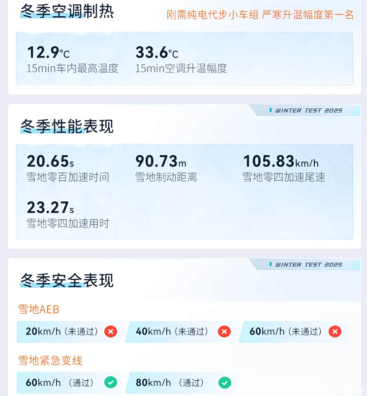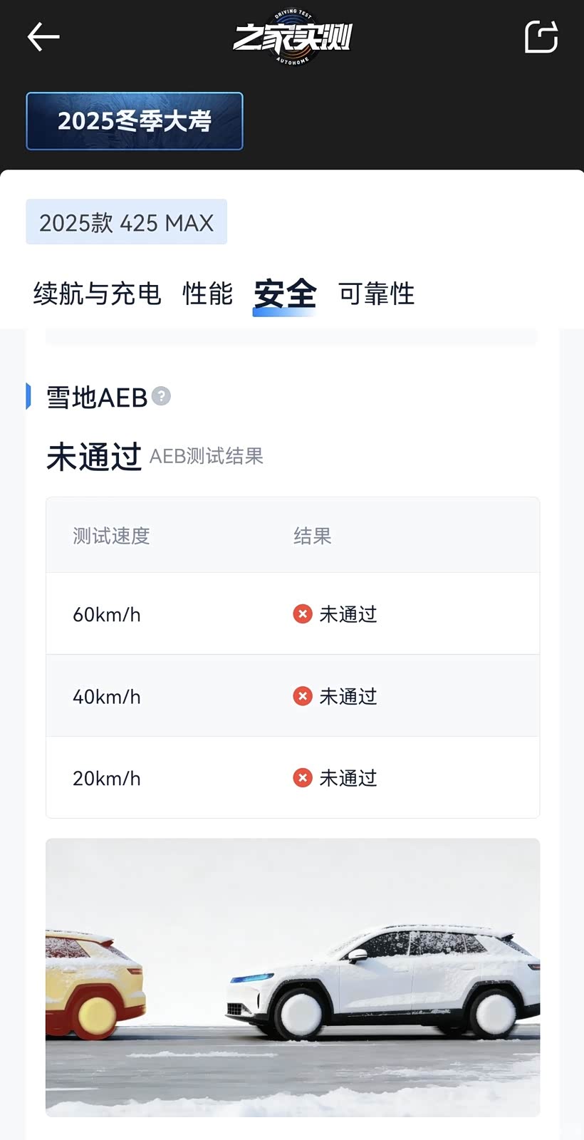 安全测试 雪地AEB 20/40/60km/h均未通过。