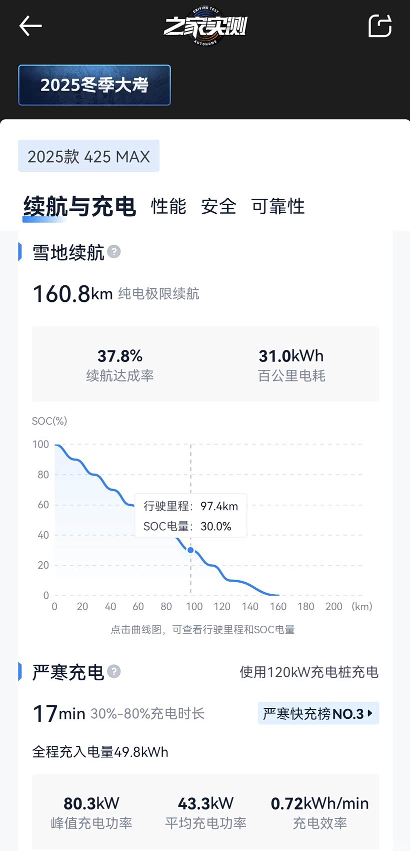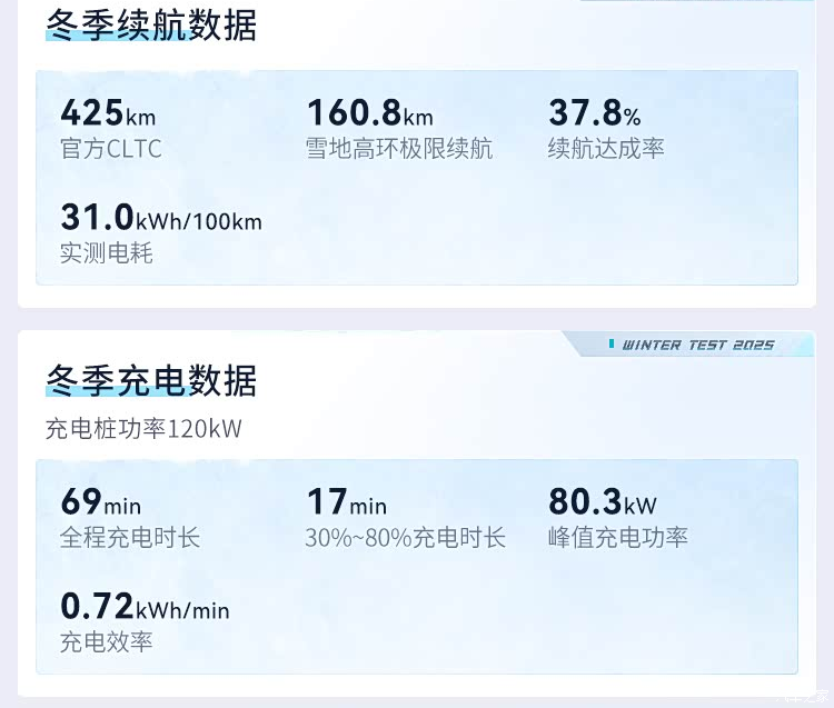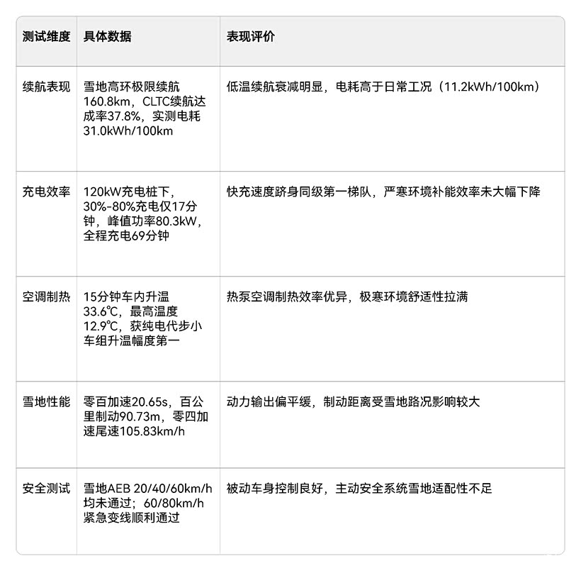 续航表现 雪地高环极限续航160.8km,CLTC续航达成率37.8%,实测电耗31.0kWh/100km 低温续航衰减明显,电耗高于日常工况(11.2kWh/100km)