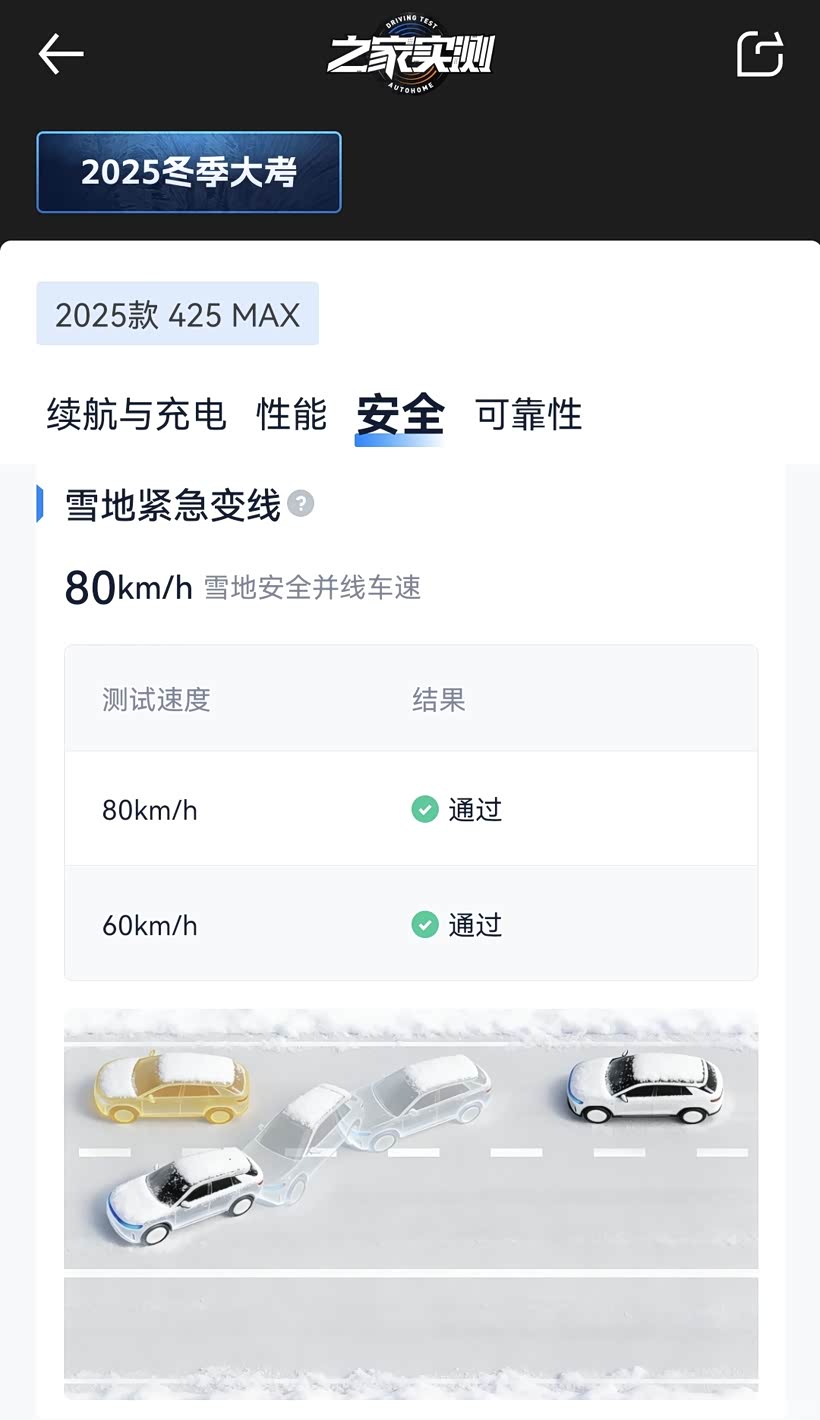 虽然雪地加速和制动成绩一般,但60/80km/h的雪地紧急变线均顺利通过,ESC系统介入及时,车身无明显推头现象,体现了不错的底盘调校功底。冬测期间,车辆动力、车机、充电等核心系统均无异常,极寒环境下的可靠性得到验证。