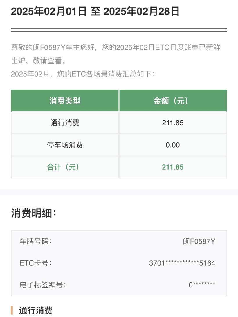 闲暇之余,我喜欢带着家人去自驾游,在放松身心的同时,也能享受当下温馨生活的惬意。今年,我们出行的范围都是在省内,跑了很多地方,寻访过游人罕至的古村落,也打卡过声名在外的5A级景区。每一笔高速通行费的背后,都珍藏着一家人的欢声笑语和难忘回忆。都存有一家人满心欢喜的回忆。不过,这年底细细盘点才发现,高速通行方面的费用支出还真是有点超出了我的预期,今年没有出省也没有跑长途,高速账单也要近两千了。(以下是其中两个月的高速费用账单)