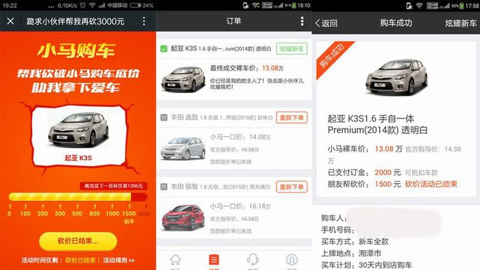【订车篇】决定了过年后再买车,于是乎继续徜徉汽车网站和论坛,不过主要是看大家砍价的信息。期间偶然看到有个帖子中一车友说某汽车电商可以全城最低价。抱着试试看的心里百度找到了官方网站,手机安装APP。注册完毕后,初步看了一下界面和购车流程,点击一口价购车,并选择K3S顶配。很快客服MM回拨电话,确认注册信息和购车车型,并承诺24小时内提供报价信息。几个小时后,收到报价,现金优惠1万3千元,价格真心不错,但是没有现车,反正年后再买,等等吧。2月底,估摸着各4S店应该开始进货了,我又询价K3S顶配和缤智自豪版,打算哪一款有现车了就买哪一款。不过两款都要预定,没有现车。几天后,某汽车电商顾问打电话给我,应该就是之后一直跟我联系购车事宜的美女杨素素,说起亚K3S三月中旬有车,于是果断下订单,等待提车。