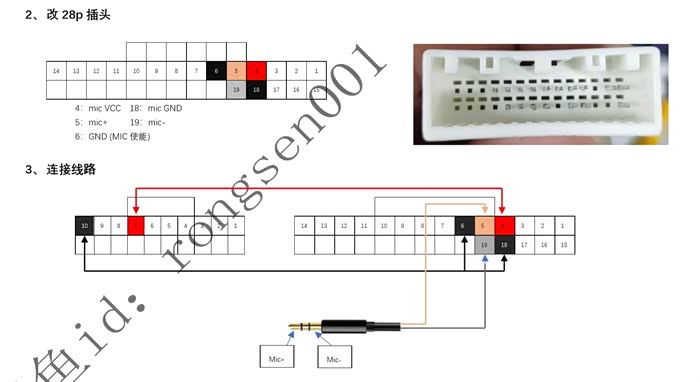 本方案适合凯美瑞19款车型,21款车型省略第一步的协议盒改装(跳至第二步直接引出mic信号端口接入车机,把接地端接好就行,电源vcc可以不接)。