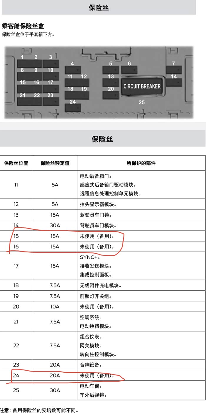 查车主说明书可以看到,车内保险丝有两个是备用的,用试电笔测了一下,15和16是acc电源,24是常电源。有加装行车记录仪的车友要注意了,不要接错了,接到acc就没发停车监控了。